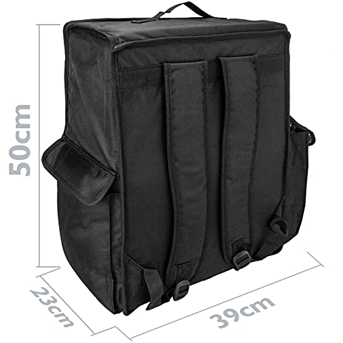 Zwarte thermische rugzak ontworpen om voedsel te vervoeren voor privégebruik of thuisbestellingen. Buitenmaat (breedte x hoogte x diepte): 35 x 50 x 25 cm. Binnenmaat (breedte x hoogte x diepte): 35 x 47 x 22 cm.